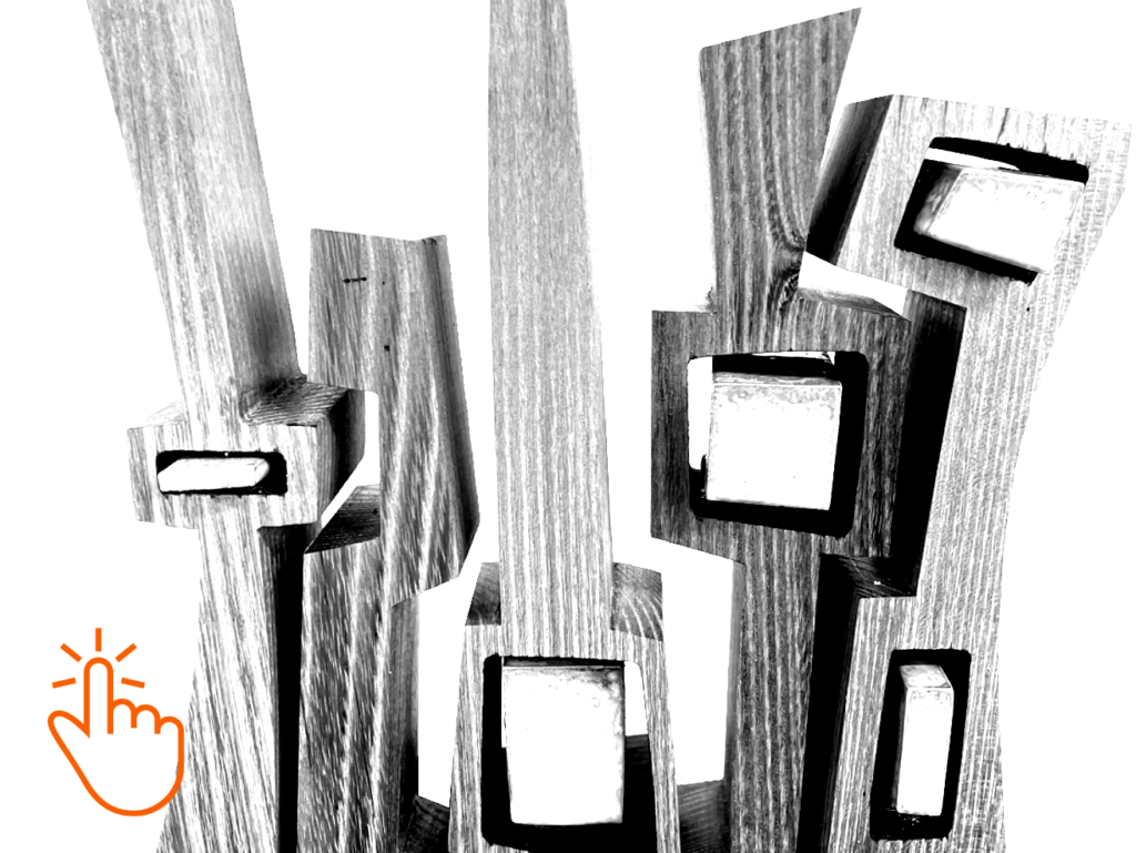 Rencontre de Nos deux Artisanats, nos savoirs-faire, nous avons crée ce buffet 3 portes, en châtaignier, brûlé, brossé, huilé, La façade des portes en céramique imitation bois offre un motif qui n’est pas si aléatoire. A la recherche d’un leurre, la céramique donne l’impression de bois mais lequel ? motif de terre craquelée, fendue, la